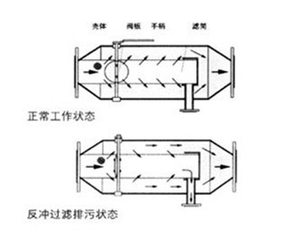 手 動蝶閥關閉,即閥板平面與筒體軸線垂直,(此時扳手旋轉(zhuǎn)90度與筒體軸線垂直),開啟排污閥,此時水流從進口進入過濾網(wǎng)筒前端,因蝶閥關閉,水流被閥板擋住,只能從前端網(wǎng)孔進入濾筒外側(cè),大部分從出口流出,而由于排污口打開,濾筒后段水排出后壓力降低,故一部分水又從過濾器后段的網(wǎng)孔反沖入網(wǎng)筒內(nèi),從而達 到從濾網(wǎng)外部沖洗粘附在網(wǎng)筒內(nèi)壁上雜質(zhì)的目的,雜質(zhì)及污水從排污口排出。